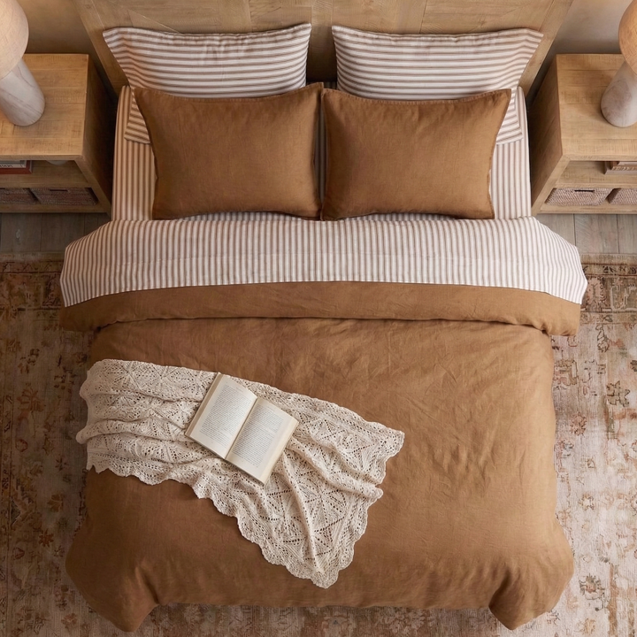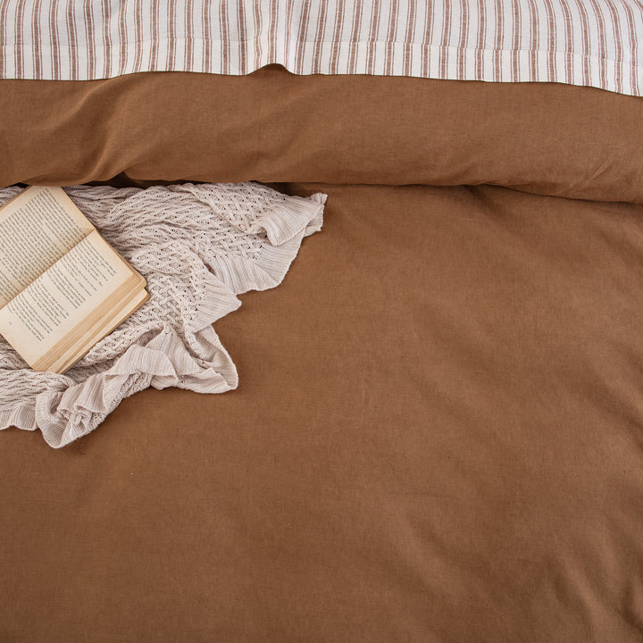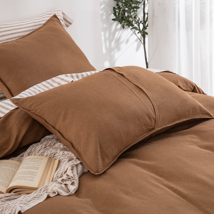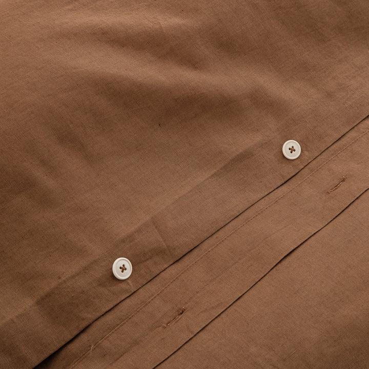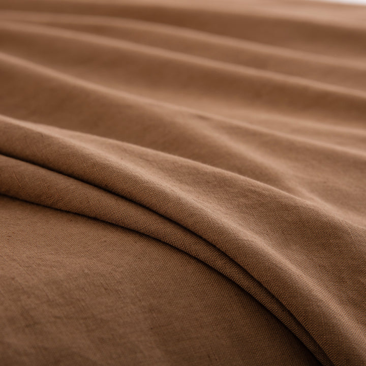 Embrace a deeply comforting and sophisticated aesthetic with our Cognac Brown Linen Cotton Blend Duvet Cover Set. Featuring a rich, earthy tone and a beautifully natural texture, this solid bedding essential anchors your space with the warmth of an organic modern retreat. Prewashed for that incredibly soft, coveted lived-in feel from day one, it brings an understated, serene luxury to your everyday sleep routine.